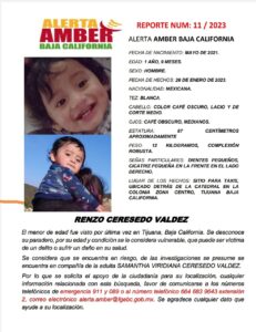 TIJUANA.- La Fiscalía General de Baja California ha activado una Alerta Amber para localizar a Renzo Ceresero Valdez de 1 año 9 meses de edad.