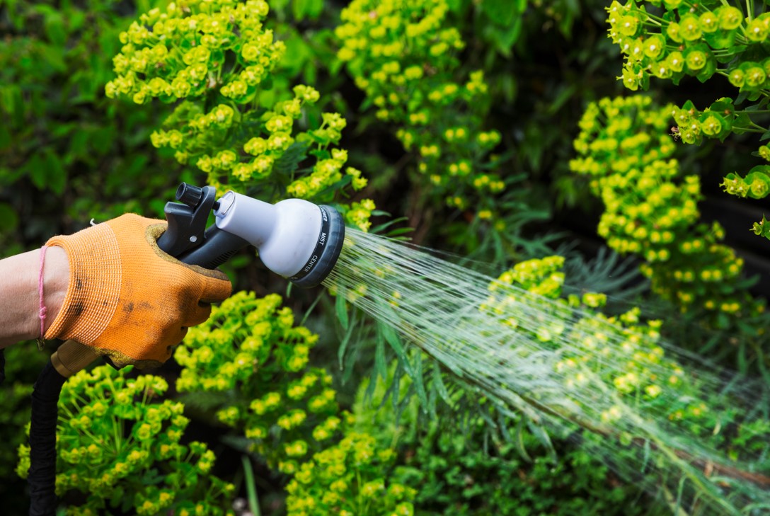 - Las áreas sin sistema de riego deben usar una manguera de mano con una boquilla de cierre, un recipiente de mano o un sistema de rociadores de manguera de jardín con temporizador.