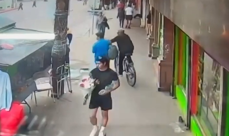 Tijuana | Un nuevo caso de inseguridad en el centro de Tijuana quedó evidenciado en un video de vigilancia que muestra el momento en que un asaltante en bicicleta arrebata un celular a un joven peatón en plena banqueta, para después huir a toda velocidad sin que la víctima logre reaccionar.