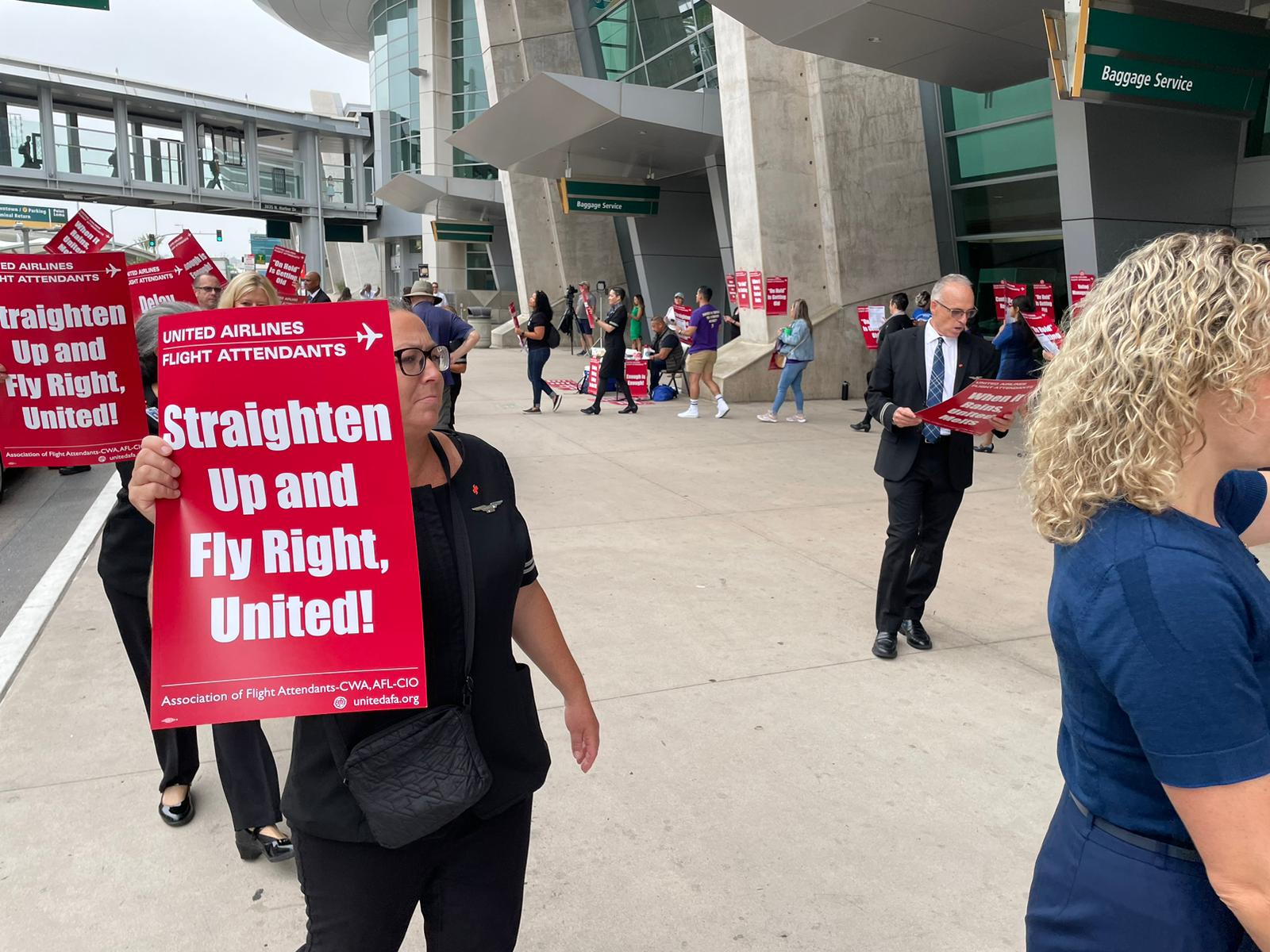 San Diego.- Decenas de asistentes de vuelo de la aerolínea “United Airlines” protestaron este jueves en un esfuerzo de exigir al corporativo que se solucionen los problemas de infraestructura interna, la dotación de personal y otros problemas que, según dijeron, causaron varios días de cancelaciones y retrasos el mes pasado.