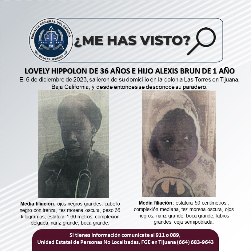 Tijuana | Una mujer de nombre Lovely Hippolon de 36 años y su hijo Alexis Brun de un año de edad, ambos de nacionalidad haitiana se encuentran desaparecidos en Tijuana.