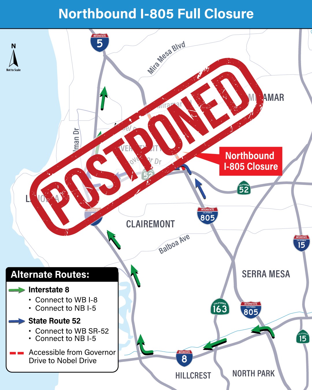 Las entradas y salidas de la I-805 en Nobel Drive permanecerían cerradas durante el operativo, por lo que se instalarían señalamientos electrónicos portátiles para informar sobre la clausura y sugerir rutas alternas.