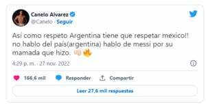 Posteriormente, Canelo publicó en sus cuentas de Twitter, “Vieron a Messi limpiando el piso con nuestra playera y bandera?” lo cual inició un debate entre fanáticos. Pocos segundos después también escribió, “Que le pida a Dios que no me lo encuentre”. Además, opinó que se debe de respetar y ser un ejemplo a seguir para la nación.
