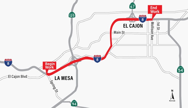 SAN DIEGO.- Los equipos de construcción de Caltrans cerrarán hasta tres carriles de la Interestatal 8 (I-8) en dirección Oeste en Main Street en El Cajon, incluyendo la rampa de acceso hacia el Oeste en Main Street en El Cajon y El Cajon Blvd, a partir de este domingo a jueves por la noche, dentro de un horario de 9 p.m. a 5 a. m.