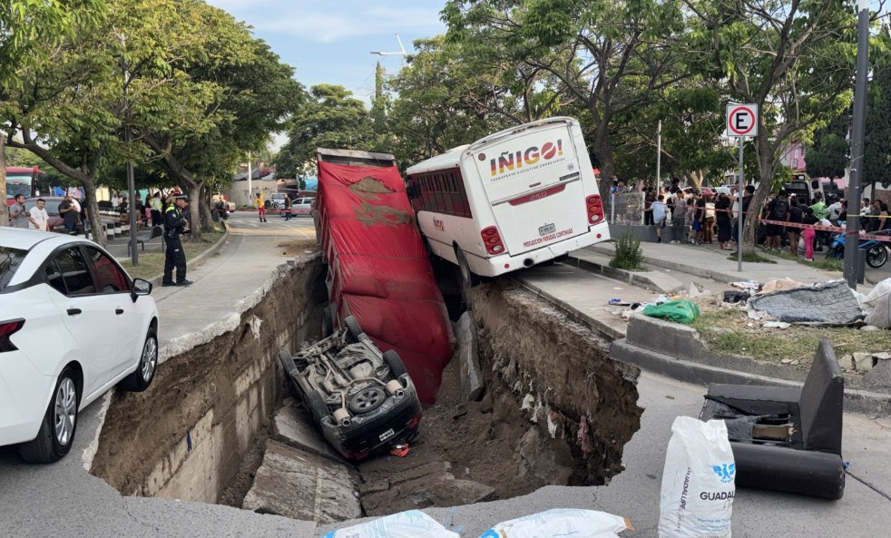 Guadalajara | Un socavón de 25 metros de largo y tres de profundidad se abrió la tarde del viernes en avenida Malecón, en los límites de Guadalajara y Tonalá, causando la caída de un vehículo familiar, un camión de transporte de personal y un camión de carga. Cuatro personas, incluidos dos menores, una recién nacida y una mujer de 32 años, resultaron con lesiones leves y fueron atendidas por el Sistema de Atención Médica de Urgencias.