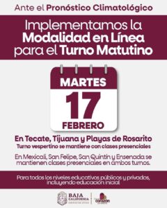 Tijuana – Autoridades educativas implementaron la modalidad en línea para el turno matutino de este martes 17 de febrero en los municipios de Tijuana, Tecate y Playas de Rosarito debido al pronóstico climatológico. La medida aplica para todos los niveles educativos públicos y privados, incluyendo educación inicial.