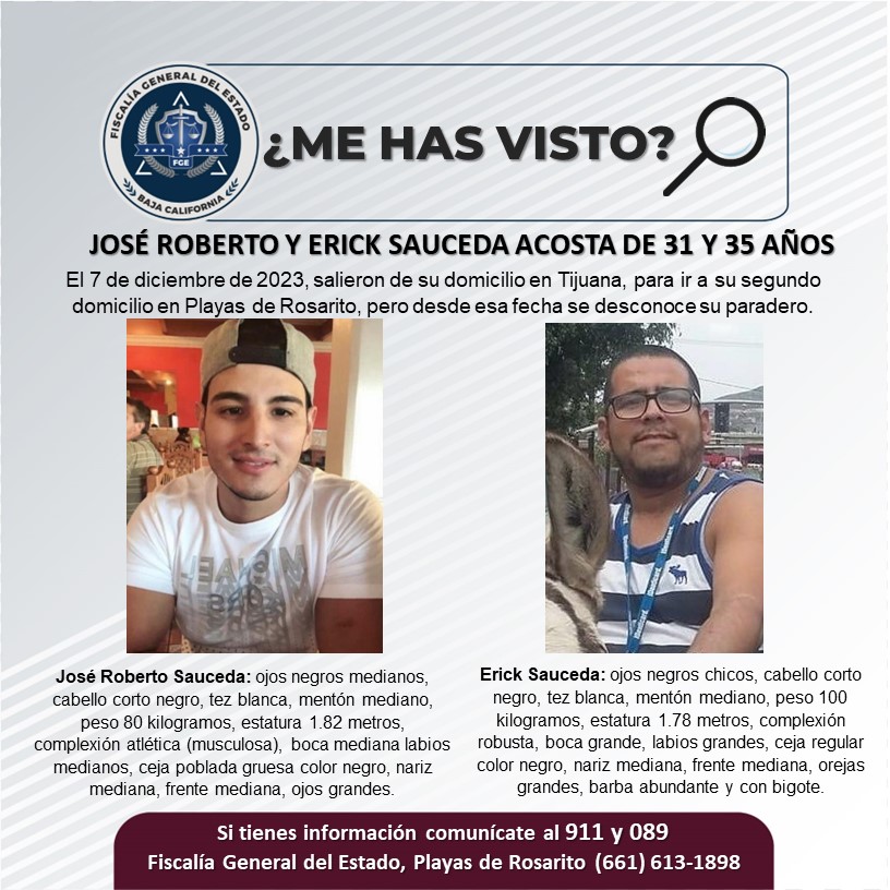 Playas de Rosarito | Autoridades y familiares buscan a los hermanos José Roberto Sauceda Acosta de 31 años y Erick Sauceda Acosta de 35 años de edad, de acuerdo al reporte de búsqueda, el 7 de diciembre de 2023, salieron por separado de su domicilio en la delegación La Mesa en Tijuana, para ir a su segundo domicilio en Playas de Rosarito, pero desde esa fecha se desconoce su paradero.