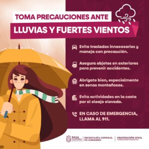 Salvador Cervantes Hernández, titular de la CEPC, explicó que desde la tarde del sábado se esperan lluvias dispersas en Tijuana, Tecate, Playas de Rosarito y Ensenada. Las rachas de viento alcanzarán los 70 kilómetros por hora en Mexicali, Tecate, San Quintín, San Felipe y Ensenada, con posibles tolvaneras.