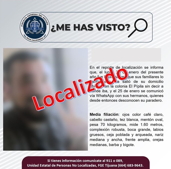 TIJUANA.- La Fiscalía General del Estado, informa que localizó con vida a un médico que se encontraba desaparecido desde el 23 de enero de 2023, pero que fue reportado por sus familiares el pasado 1 de febrero de 2023, por lo que se generó una pesquisa para su búsqueda.