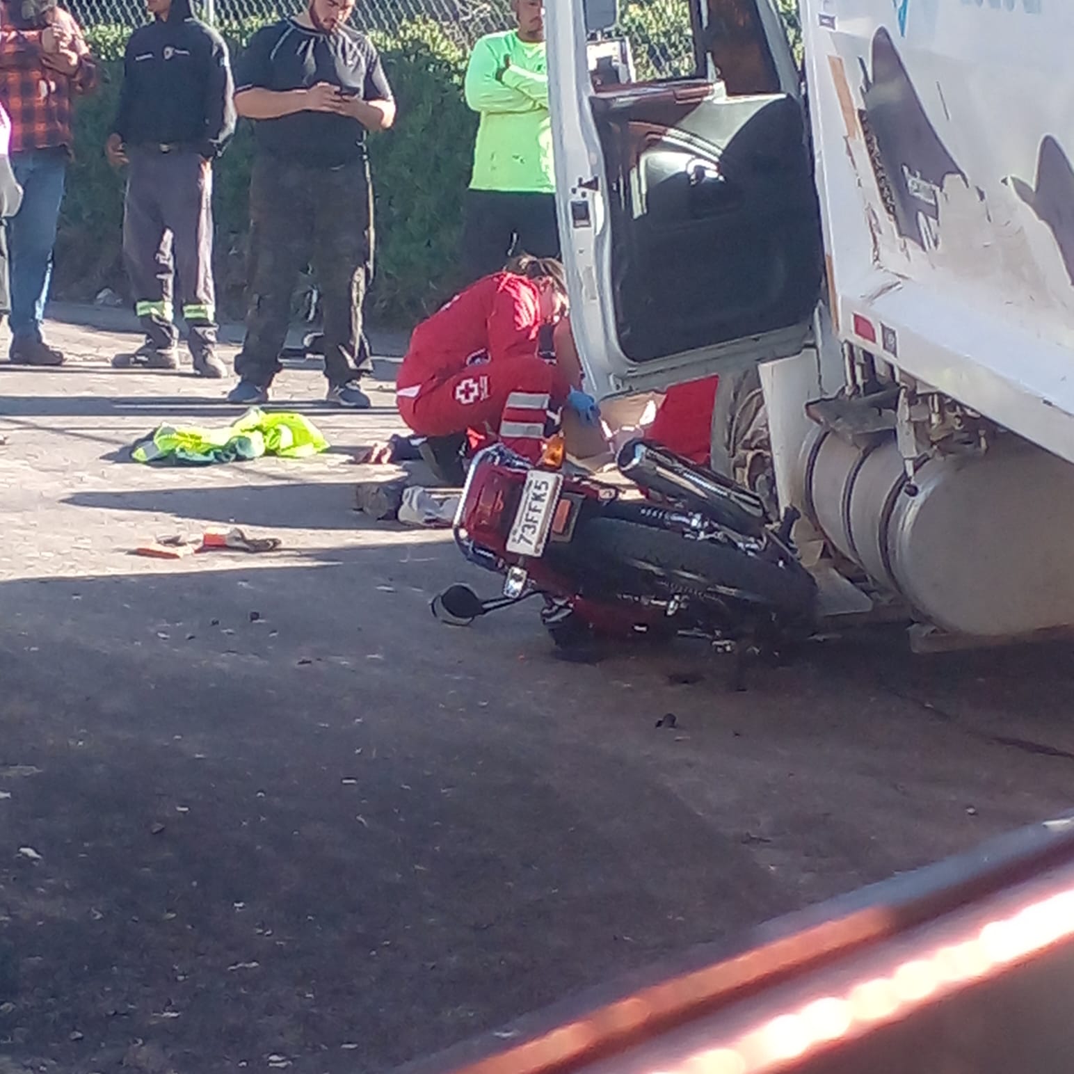 La víctima en estado de gravedad quedó tendida en el piso frente al camión hasta que paramédicos de la Cruz Roja llegaron al lugar para brindarle los primeros auxilios y trasladarlo a un hospital.
