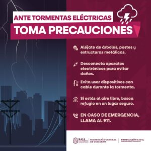 Las autoridades recomiendan no cruzar arroyos, conducir con precaución, resguardarse durante tormentas eléctricas y asegurar objetos en azoteas y patios.