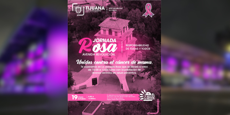 Tijuana, Baja California.- Este sábado 19 de octubre, el Ayuntamiento de Tijuana realizará la Jornada Rosa en la Torre de Agua Caliente, iniciando con una caminata a las 9:00 de la mañana. Durante el evento, se ofrecerán servicios de salud para mujeres, incluyendo 10 mil mastografías gratuitas para mujeres de 40 a 69 años con factores de riesgo de cáncer de mama. La actividad es parte de las acciones del gobierno municipal en el marco del Día Internacional de la Lucha Contra el Cáncer de Mama.