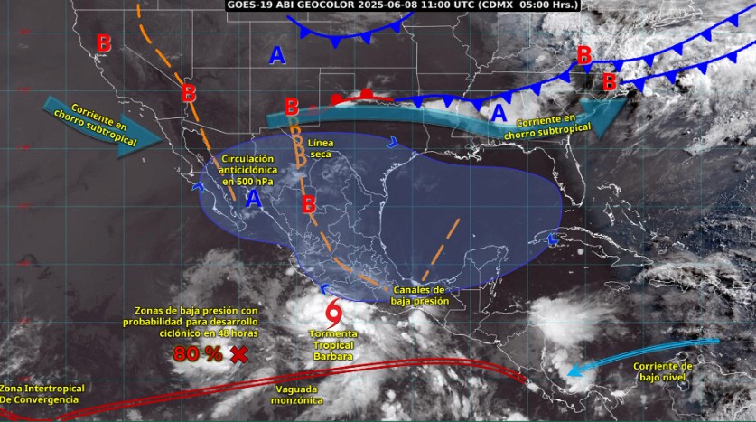 México | La tormenta tropical Bárbara, formada en el Océano Pacífico, se intensificará a huracán categoría 1 la madrugada del lunes 9 de junio, de acuerdo con la Conagua. Su trayectoria afecta principalmente las costas de Guerrero, Michoacán, Colima y Jalisco.