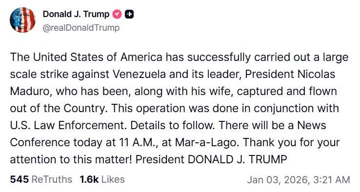 Trump señaló que Maduro y su esposa fueron capturados y trasladados en avión fuera de Venezuela, y adelantó que ofrecerá más información en una conferencia de prensa programada para las 11 de la mañana en Mar-a-Lago.