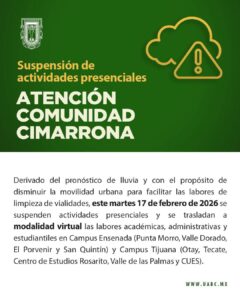 La Universidad Autónoma de Baja California (UABC) informó que este martes 17 de febrero se suspenden las actividades presenciales en sus campus de Ensenada, Tijuana, Tecate, Rosarito y Valle de las Palmas debido al pronóstico de lluvia. Las labores académicas, administrativas y estudiantiles se trasladan a modalidad virtual.