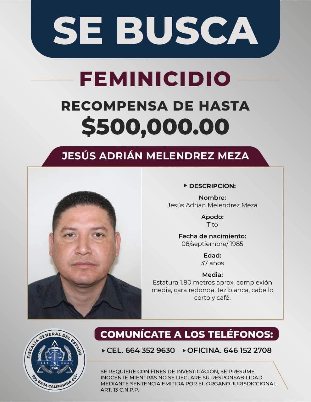 ENSENADA.- La Fiscalía General del Estado de Baja California, solicita la colaboración de la población para que proporcione información que lleve a la localización de Jesús Adrián Melendrez Meza, quien cuenta con una orden de aprehensión en su contra y es buscado por esta autoridad por la probable comisión del delito de feminicidio.